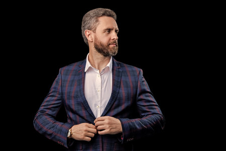 Business boss in suit. Big boss. Professional businessman. Businessman. Business leadership and success. Successful business man in office. Office manager boss isolated on black. Copy space