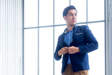 Handsome young businessman Asian caucasian wear a suit and long sleeve shirt in side, and standing smart poses in a modern office.