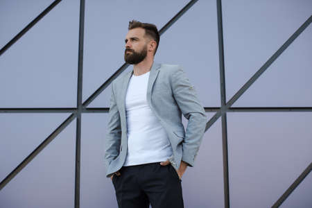 Portrait of a businessman on the street near the road of a European city. A bearded handsome man dressed stylishly. Fashionable guy hipster. Stock photos
