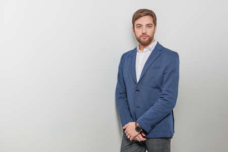 Elegant young handsome man posing in studio, looking at camera. Man with beard.