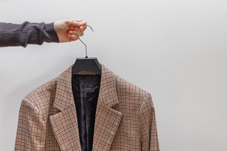Feminine hand holding a jacket on a hanger against the white wall. Stylist, fashion, copy space
