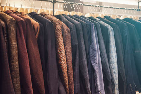 A row of mens suits on hangers in a clothing boutique. Elegant suit jackets of different colors and textures hanging on the rack. Creative mens fashion background.