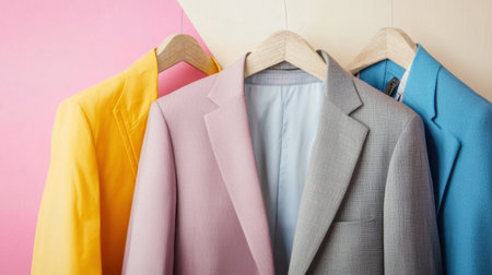 A vibrant display of three stylish blazers hanging on wooden hangers against a colorful backdrop, perfect for enhancing fashion marketing and retail visuals.