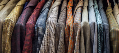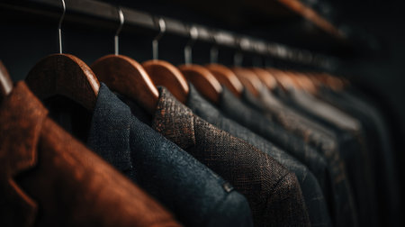 A row of jackets hangs in a dark closet, showcasing various textures and patterns. The lighting highlights the different shades and materials of the garments. This image could be used for fashion-related advertising, editorial content, or design projects. The composition creates a sense of luxury and sophistication.
