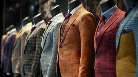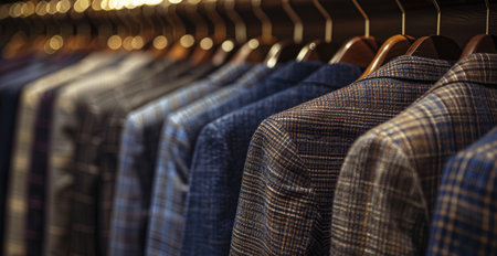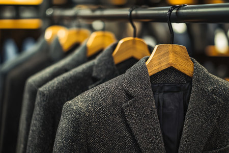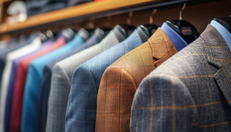 Elegant men's jackets in various shades drape on a sleek rack, capturing a sophisticated retail ambiance perfect for fashion showcases.
