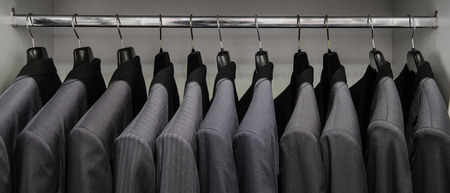 Male mens gray business suits on hangers on a shop, wardrobe or closet rail