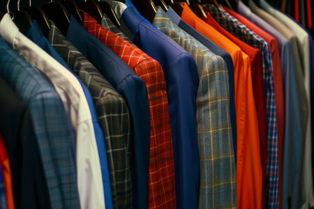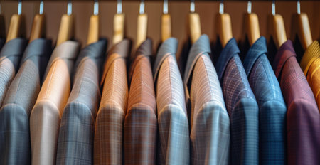 A close-up view presents a row of diverse suits suspended from wooden hangers. Varied textures and hues, including blues, reds, and grays, are visible in the fabrics. The lighting suggests an indoor setting, and the composition focuses on the display of garments, which can be applicable for fashion-related projects.
