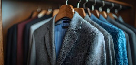 A collection of tailored suits hanging elegantly on wooden hangers inside a cozy wardrobe. The image reveals an array of colors and textures, showcasing distinct styles. The suits are neatly lined up, suggesting a serene atmosphere full of style and sophistication. No transparency present in the background.