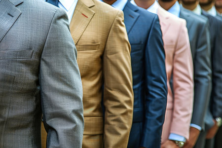 A row of neatly lined up mens suits, worn by office workers, creating a professional and organized display.