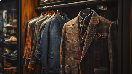 Sophisticated men suits displayed on hangers, creating a stylish atmosphere in a clothing store, perfect for formal occasions and business attire