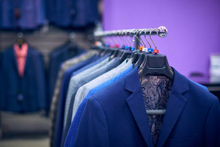 Mens suits in different colors hanging on hanger in a retail clothes store, close-up
