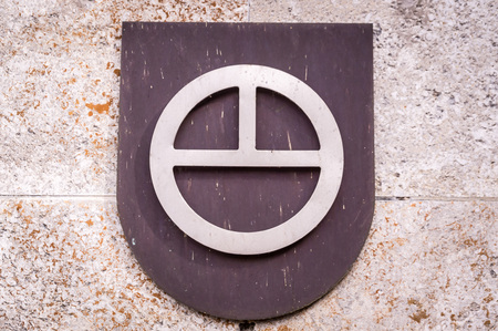 A Vysehrad Chapter as small blazon on wall stone in prague. Czech republic. Old wall