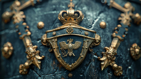 3D digital illustration of medieval coat of arms with gilded cross blades and golden shield