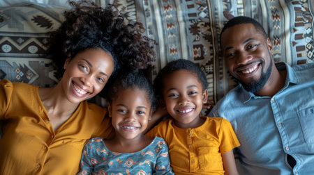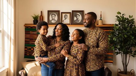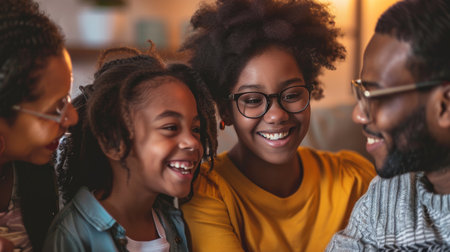 Medium shot of a Black family sharing moments of happiness in a snug, cozy home, warmth, affectionate family bonds, inviting and comfortable atmosphere, joyous familial expressions.