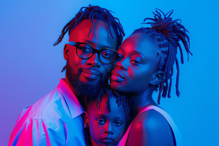 A joyful family portrait showcasing love and connection. The vibrant background enhances the warmth of their smiles, capturing a moment of togetherness and happiness.