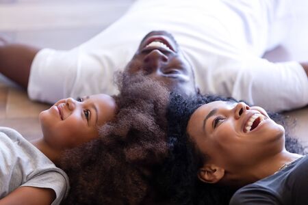 Close up cheerful carefree african family and small daughter lying together on warm floor touching heads feels happy having fun spending free time on lazy weekend at home, love and connection concept