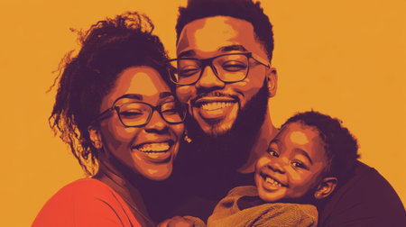 An AI generated illustration of a cheerful African American family joyfully embracing their child