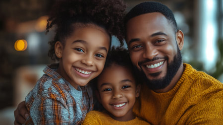 A cheerful moment featuring a father and his two adorable daughters smiling happily. Captures warmth, love, happiness, and family bonding with a colorful background setting.