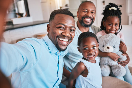 Black family, selfie and father on a couch with children on a couch or sofa bonding, smile and happy in a home. African, grandfather and dad relax with kids as love, care and support in living room