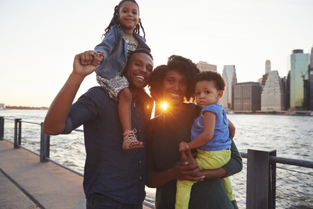 Portrait of black African ethnicity family with children on the sofa at home having fun