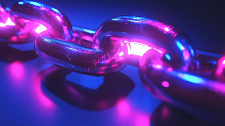 A mesmerizing close-up view of a glowing chain link, highlighted with vivid purple and blue tones, perfect for showcasing themes of strength and connectivity in digital art.