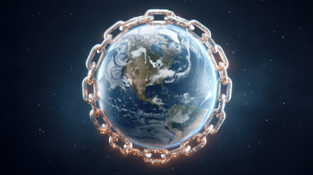 A digital artwork of the Earth encircled by luminous chains, illustrating themes of connection, technology, and unity against a cosmic backdrop, symbolizing global collaboration.