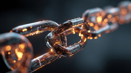 A striking transparent chain link with glowing elements set against a dark background, symbolizing connectivity, strength, and technological advancement. Ideal for digital themes.