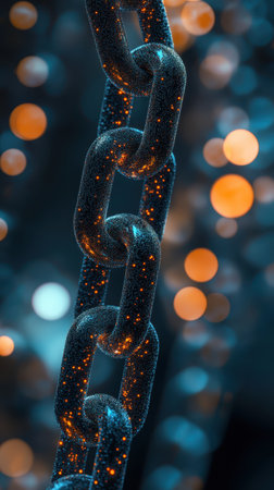 Close-up of illuminated metal chain links with bokeh effect, abstract technology concept