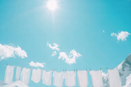 White garments hang on a line, gently swaying in the breeze under a clear blue sky with bright sunlight and fluffy clouds above.