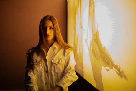 The brunette poses at night in front of a glowing yellow banner. A teenage girl in a white denim jacket, black t-shirt at night illuminated by yellow light.