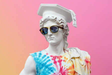 Marble sculpture of a guy wearing sunglasses and a graduation cap on a pink background. Education Concept.