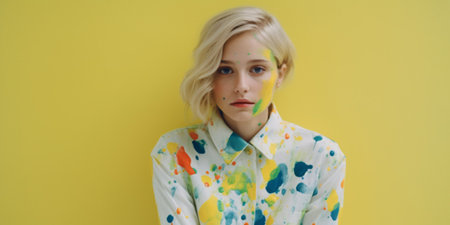 Beautiful blonde girl in a multicolored shirt on a yellow background
