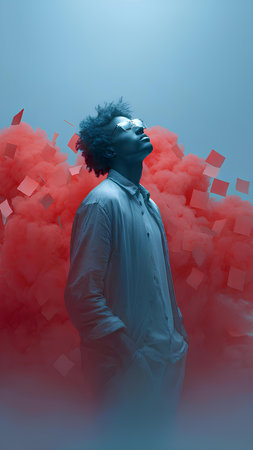 A man is smoking a cigarette and the smoke is coming out of his mouth. The image has a colorful and vibrant feel to it, with the smoke and the man's face being the main focus