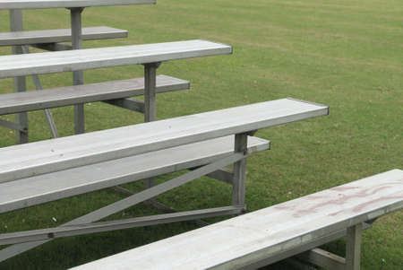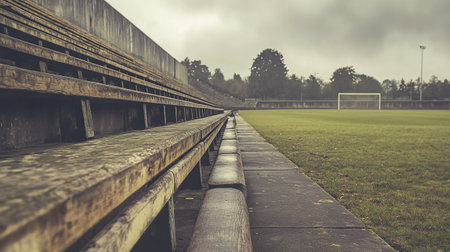 Close-up of empty bleachers in a stadium, soft lighting, with copy space for message or branding