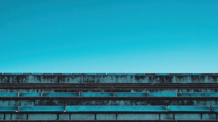 A captivating view of empty stadium bleachers leading upward, showcasing architectural design and symmetry under a clear blue sky. Ideal for sports or event imagery.