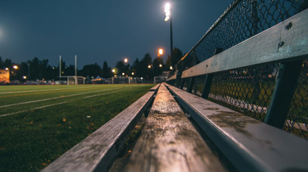 A serene view of empty bleachers on a sports field, illuminated by soft floodlights under a dark evening sky, showcasing a fresh green turf after rain.