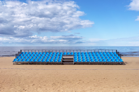Rows of blue seats at the podium on a yellow sandy beach of the Baltic Sea with white clouds in the sky over the sea