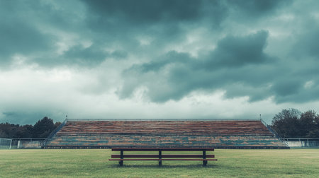 Football stadium with grass field and bench under cloudy sky, vintage filter