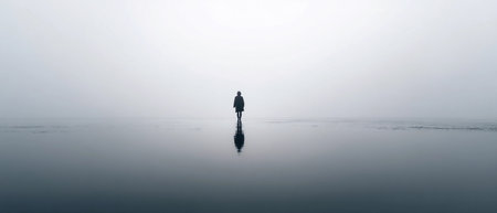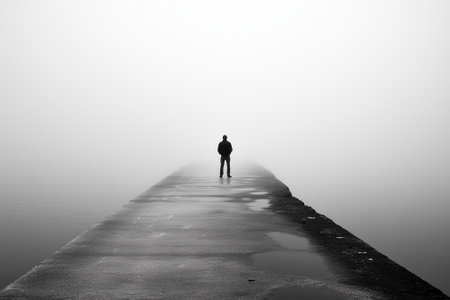 Tranquil figure stands quietly on a misty pier, fully embracing the profound silence and stillness of the fog. Generative AI