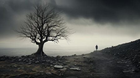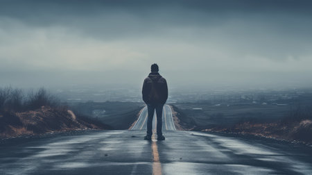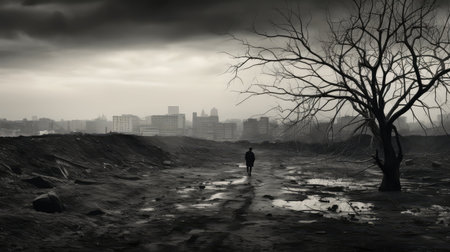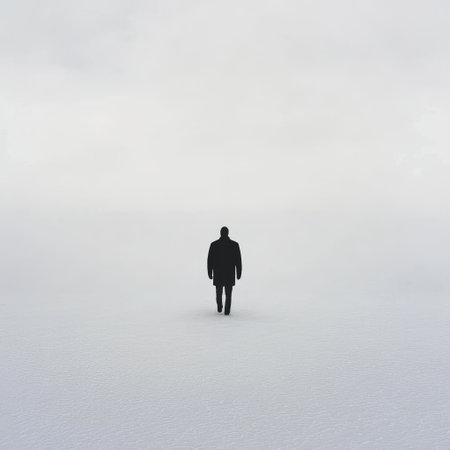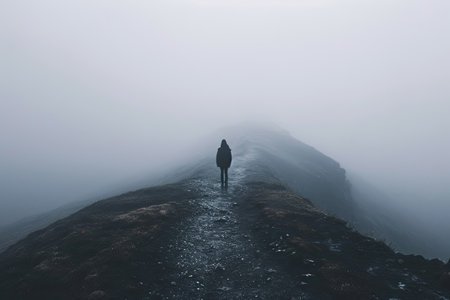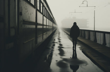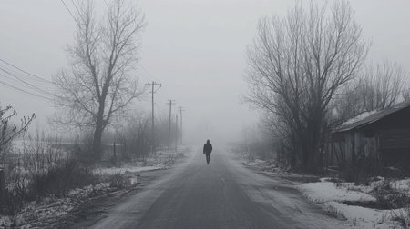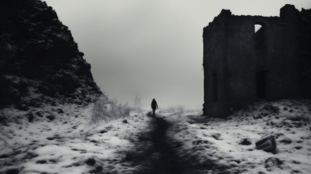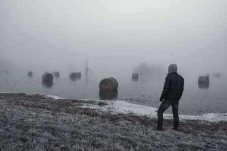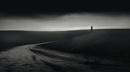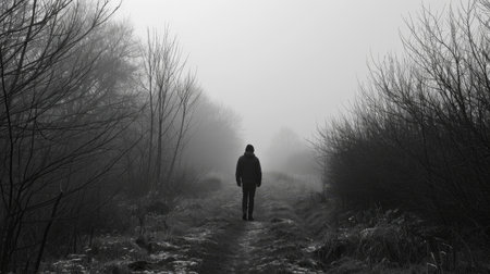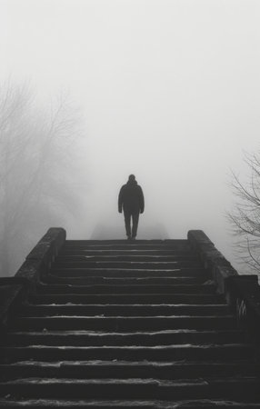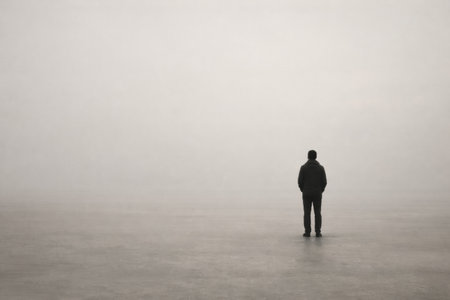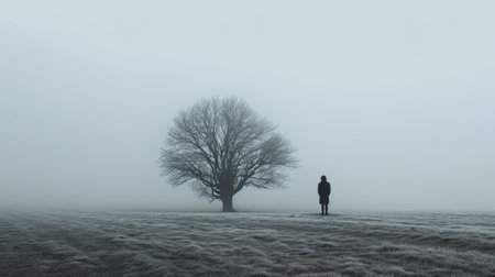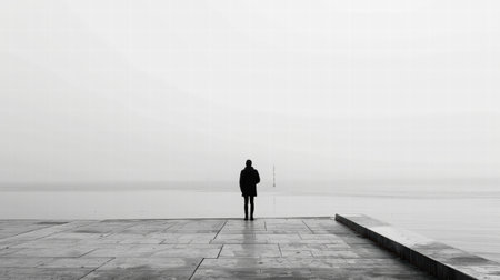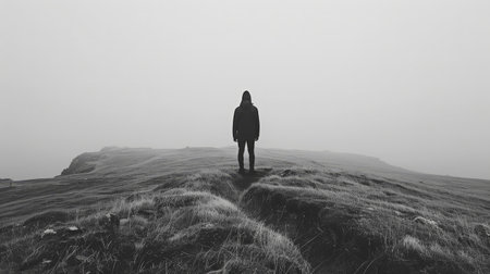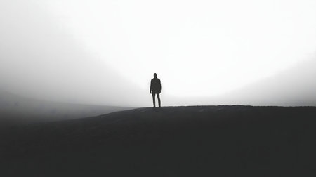 A lone man stands silhouetted against a misty landscape. The monochrome palette enhances the feeling of solitude.