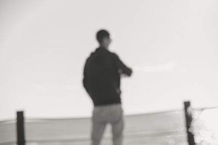 Back view of defocused unrecognizable man on the beautiful travel sea background. Sunny water horizon natural outdoors