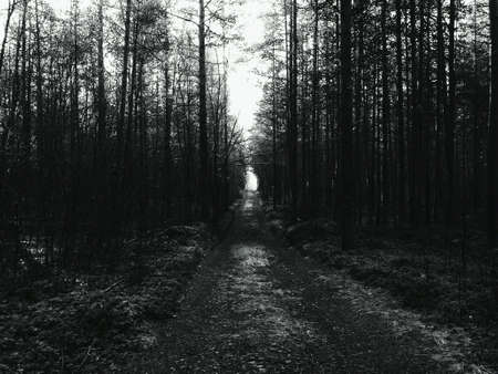 a foglit road winds through a dense forest, capturing the dark and gritty style of realistic landscapes. the soft edges and absence of color add to the mysterious atmosphere. this scottish landscape embodies the lo-fi aesthetics and adventure-themed artwork of einar hkonarson. ai generated