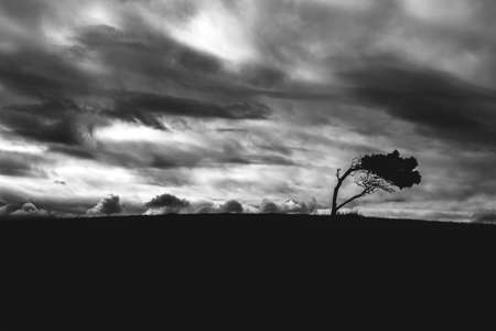 A black and white dramatic shot of a solitary tree in the middle of a meadow with giant clouds and copy space