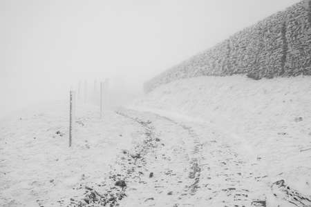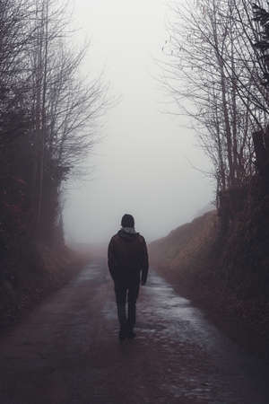 Man walking in the snow in a foggy winter day. Winter landscape.