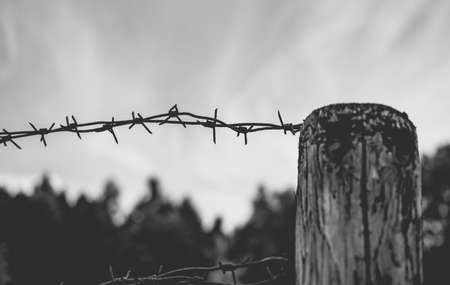 Grayscale image shows a barbed wire fence in the foreground, with a group of people walking away in the background on a path through a foggy landscape. The image evokes a sense of displacement and hardship.