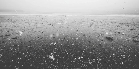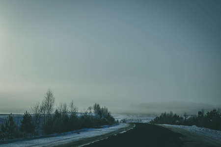 black and white noisy and fuzzy winter landscape shot on film, wild and deserted winter beach and embankment, the concept of minimalism and silence