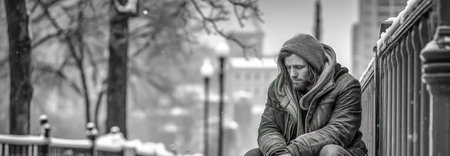 homeless man on the street of a big city, banner with copy space made with Generative AI