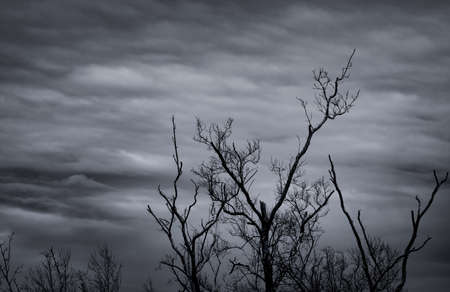 Silhouette dead tree on dark dramatic sky and white clouds background for a peaceful death. Despair and hopeless concept. Sad of nature. Death and sad emotion background. Dead branch unique pattern.