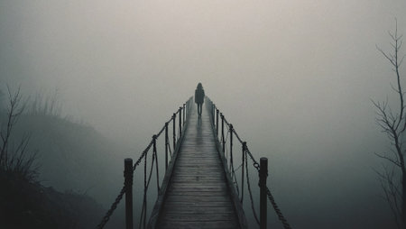Fear and Uncertainty Concept of Depression Illustrated with Person on Crumbling Bridge