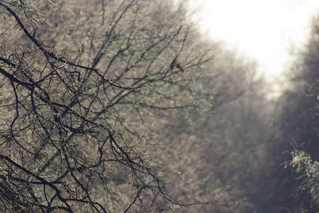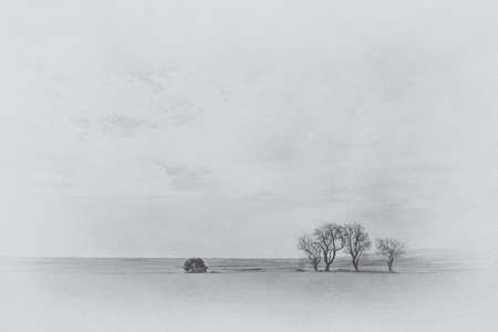 Lonely trees in a fog. Blizzard. Atmospheric winter landscape. Nature, ecology, climate change. Panoramic black and white image, copy space